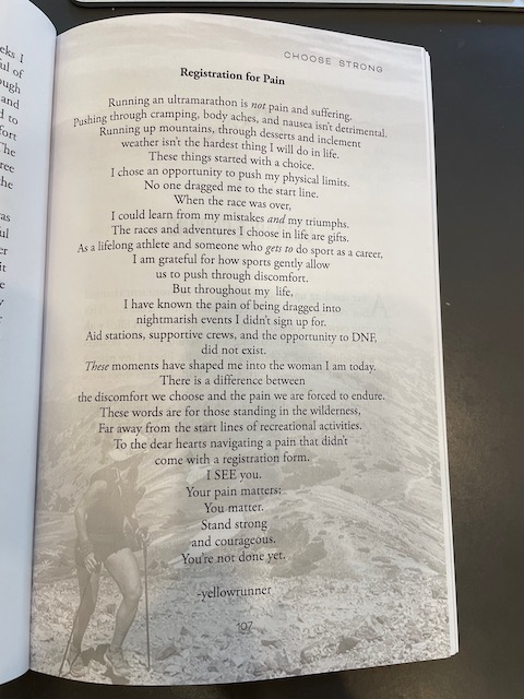One of the most memorable and unique aspects of the book, I think, are the poems and other sections that speak directly to the reader. For example, between chapters 13 and 14, there is a poem called “Registration for Pain” printed over an image of the author running up a mountain with poles while looking back down the valley, over her shoulder. At her eye level, it reads: “To the dear hearts navigating a pain that didn’t come with a registration form. / I SEE you. / Your pain matters; / You matter. / Stand strong / and courageous. / You’re not done yet” (107). It’s as if the author says this directly to the reader, who is somewhere on the slope behind her.
