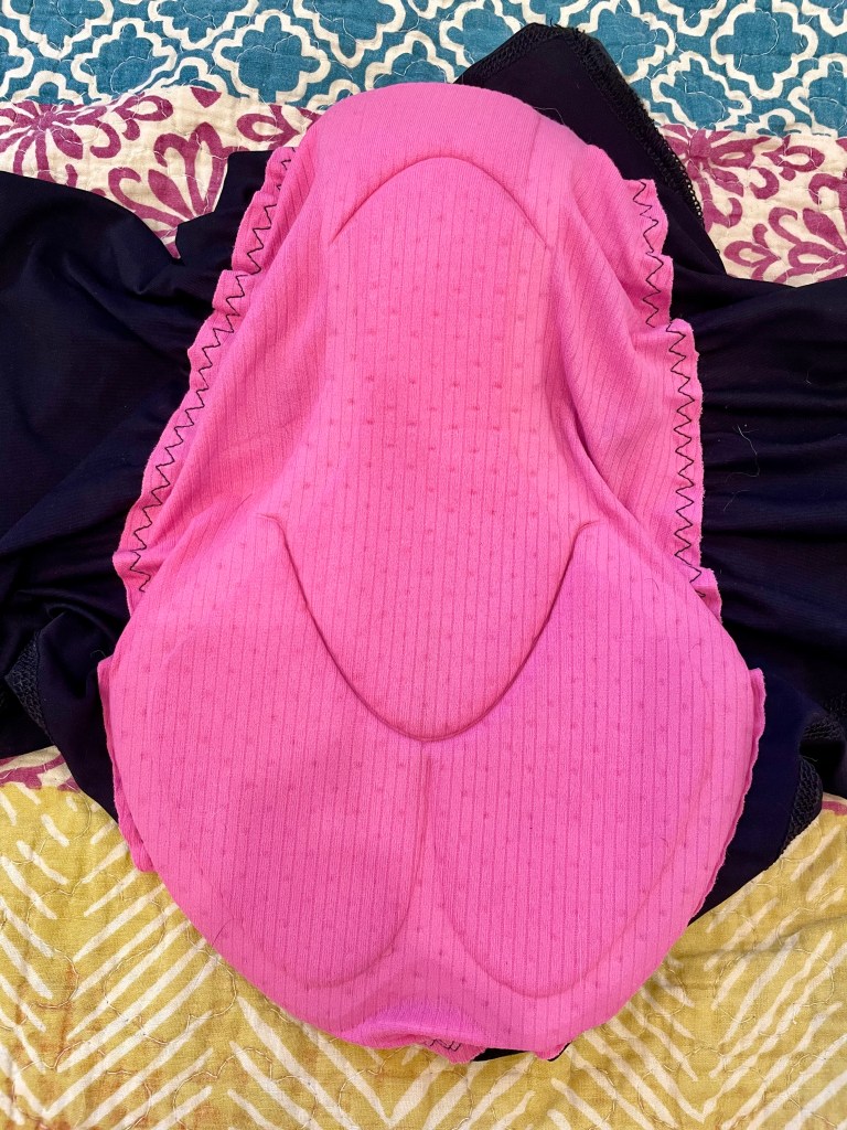 Flex Air Max chamois: The Max chamois has 2 extra layers of padding, according to the website description: “New for 2023, the Flex Air Max was developed to provide an extra level comfort by adding two additional foam layers in key positions on the chamois surface. This multi-density approach is combined with Terry’s innovative shaping and soft wing technology. Seamless chamois with 4-way stretch Elastic Interface Technology provides freedom of movement on the saddle; multi-density foam padding is perforated for increased breathability; light, channeled microfiber fabric in Terry pink is antimicrobial and enhances moisture transfer; soft wing construction reduces bulk at inner thigh to avoid chafing. Made in Italy.” I was worried it would feel bulky and create discomfort, but after wearing these for several longer outings, I can report that the bulk isn’t a problem and they are very comfortable on their own or under mtb shorts. The pad looks just like the Bella pad. You have to feel them to notice the slightly more padded Max. I feel it especially under my sit bones.
