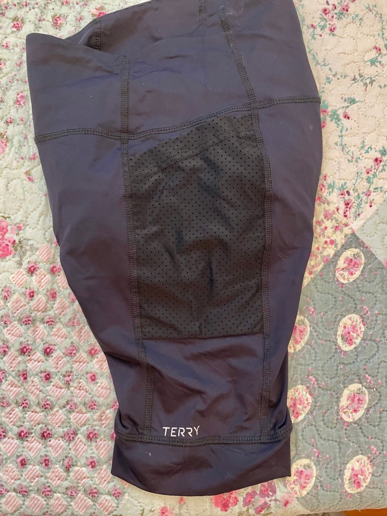 Waist band: On me, the waistband of the Holster Prima comes up above my belly button to the middle of my waist. I think the height is perfect, and the amount of compression vs. stretch feels good. Here’s my critique: the top seam of the waistband feels fairly rigid and is hard to get over my hips to pull on, it almost feels like I’m breaking it. I don’t know if this is just a one-off with the pair of shorts I have, or if this is a universal experience, or if my hips are wide. Size-wise, I am at the very upper end of a Terry size small, I wear a small in Bella Primas and the Bella Max, so this is my usual size, but I don’t have this experience of tightness with the top of the waist band in any other pair of Terry shorts, so I assume it’s limited to the Holster Primas. I expected the top of the waistband to be stretchier. This band also makes it harder for me to quickly “drop trau” and pull them back on if I have to pee, but at least you don’t have to deal with bib straps! Maybe it will loosen up over time.
