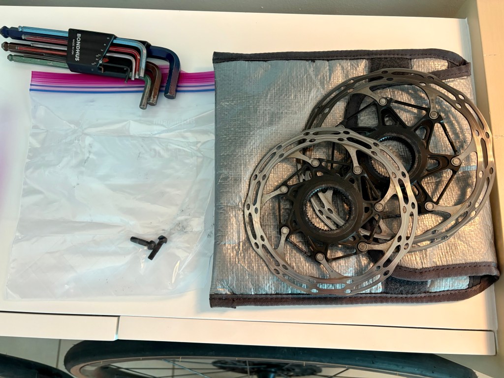 - Joann’s tools wound up being different than mine – he mostly just used a multitool. The tools you need to bring depend on your specific bike components. For example, his rotors did not require a lockring tool and wrench. Here’s what I bring for my Quincy in the tool bag that comes with the Dakine bike bag (left side, in the photo below): hex set, wrench and cassette lockring tool to remove rotors, and a chain breaker tool. I also have the toolset in my OneUp pump that goes on my bike (has a multitool and tire lever inside, and other goodies). I also take in 3 separate ziplock bags: my chain, pedals, and the screws that I take off my headset. The rotors have their own separate silver pouch that also comes with the Dakine bag. The ziplock baggies go in the silver roll-up tool kit to keep everything together.