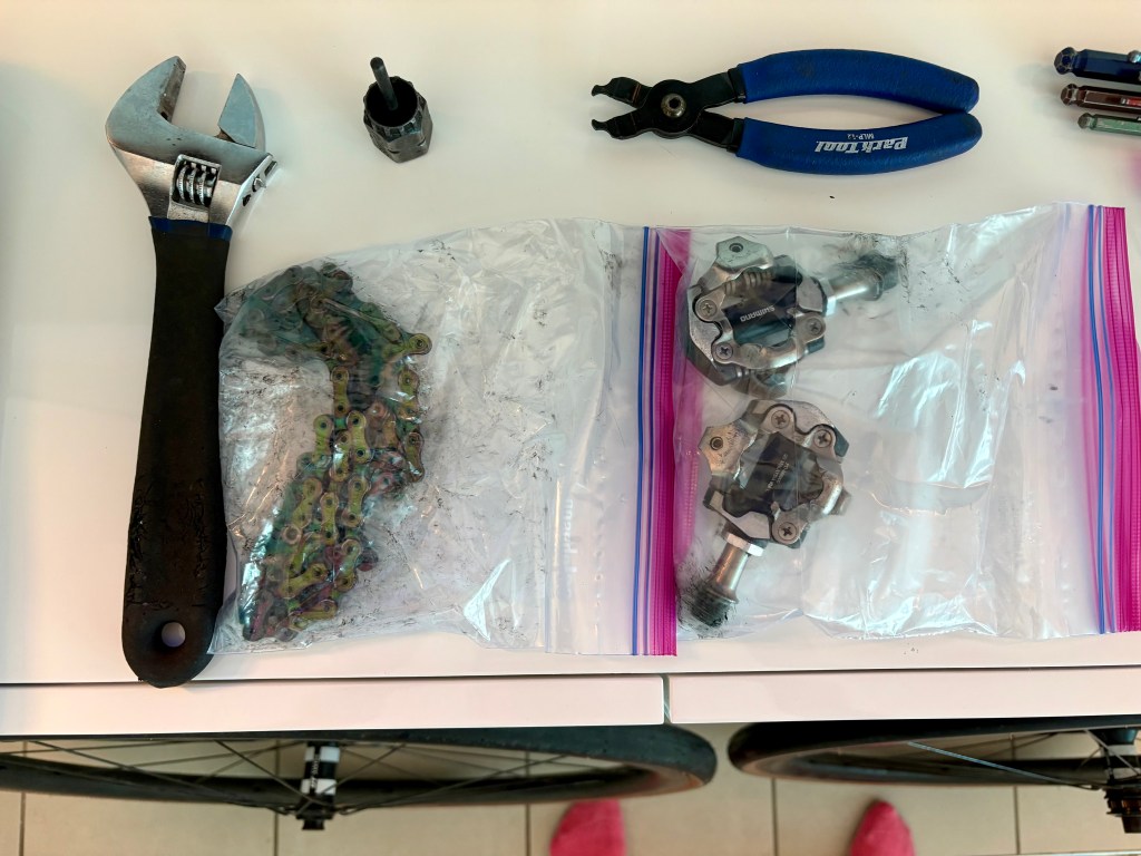 2. I take my chain off, whereas Joann leaves his on. The chain and links travel in their own plastic baggie in the toolkit bag. This is actually how I learned to take off and put a chain back on!